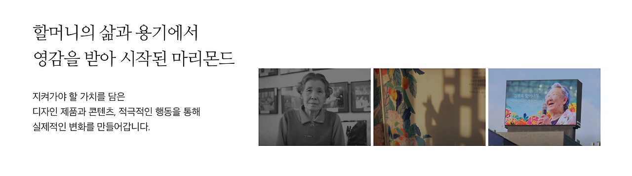 다른 예로는 인권을 위해 행동하고 폭력에 반대하는 라이프 스타일 브랜드 '마리몬드'가 있습니다. 위안부 피해 할머니들과 학대 피해 아동 프로젝트를 통해 그 아픔과 용기를 잊지말자는 의미를 담고 있죠. 대표적인 디자인으로는 위안부 피해 할머니 한 분 한 분의 삶을 상징하는 꽃 디자인으로 상품화하여 판매하고 있습니다. 마리몬드는 2015년 이후 매년 200% 이상 성장하며 미닝아웃 소비의 영향력을 보여주고 있습니다.