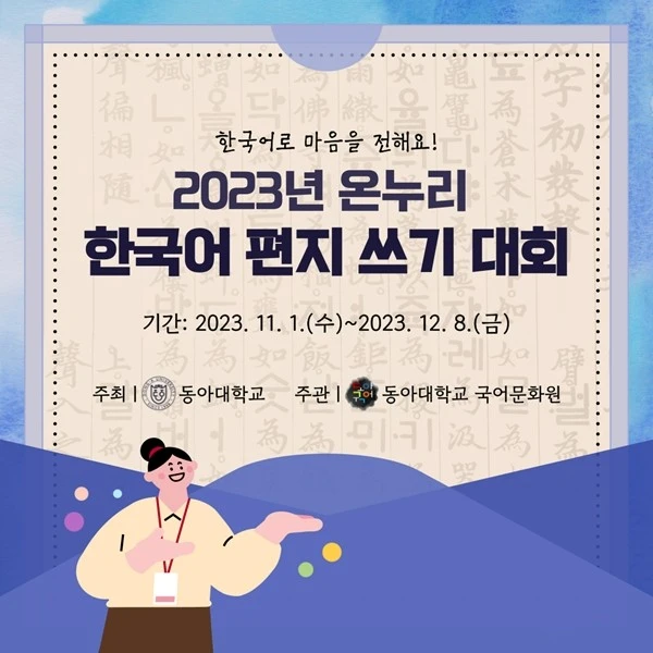- 국어문화원 누리집(kor.donga.ac.kr)에서 신청서를 내려 받아 작성한 후 손으로 쓴 글과 함께 우편이나 이메일로 보내 주세요!