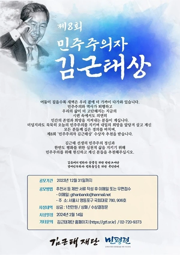 깊은 경의를 바치며, 8회 ‘민주주의자 김근태상’ 수상자 추천과 신청을 받습니다.