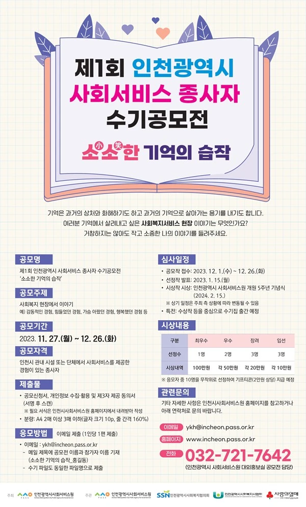 - 전화 : 인천광역시 사회서비스원 대외홍보실 공모전 담당 032-721-7642