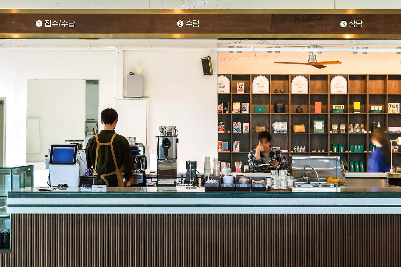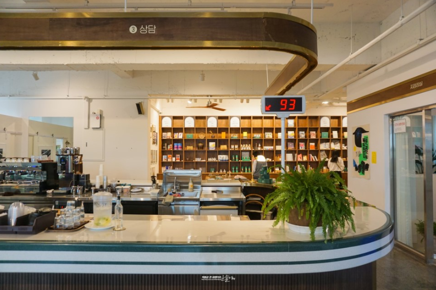 농협 은행 창구는 본래의 틀을 유지한 채 현대적인 디자인 요소를 넣어 뉴트로한 감성 카페로 만들어주었습니다. 음료 주문을 하게 되면 은행처럼 번호표를 나눠줍니다. 음료가 다 제조되면 띵동~ 소리와 함께 창구로 가서 픽업하면 됩니다. 은행의 번호표 시스템을 유지하고 카페에 적용하여 위트 있는 요소가 되었습니다.