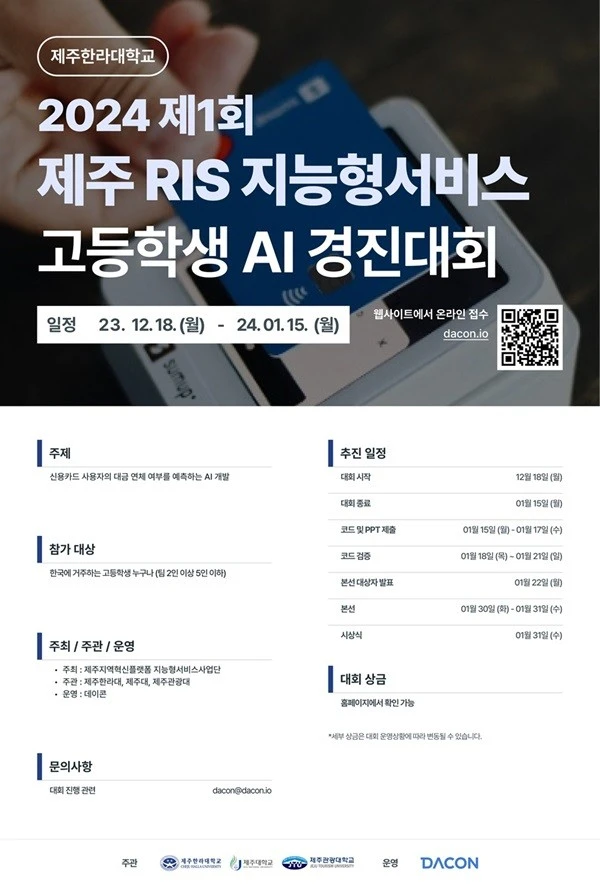 * 단, 오프라인 본선에는 데이콘 온라인 예선에서 선발된 20팀과 주최 초청 제주 10팀으로 총 30팀으로 진행됩니다.