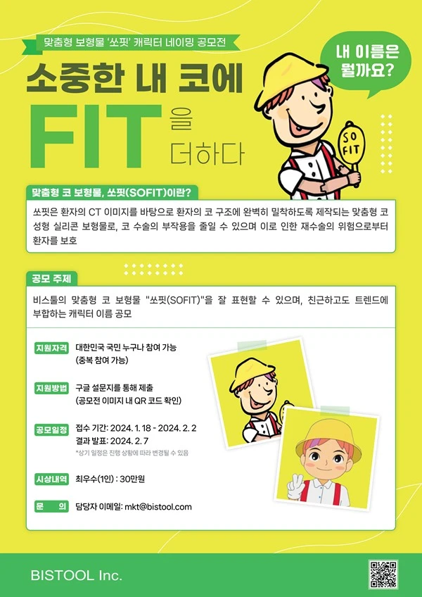 - 비스툴의 맞춤형 코 보형물 "쏘핏(SOFIT)"을 잘 표현할 수 있으며, 친근하고도 트렌드에 부합하는 캐릭터 이름 공모