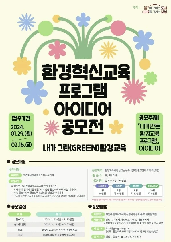 - trust@gangnam.go.kr *제목은 ‘환경교육 프로그램 아이디어 공모전 지원(이름)’으로 통일