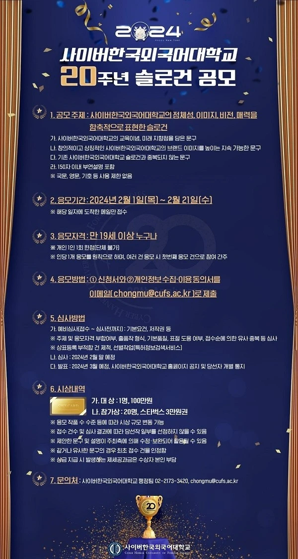 - 발표 : 2024년 3월 예정, 사이버한국외국어대학교 홈페이지 공지 및 당선자 개별 통지