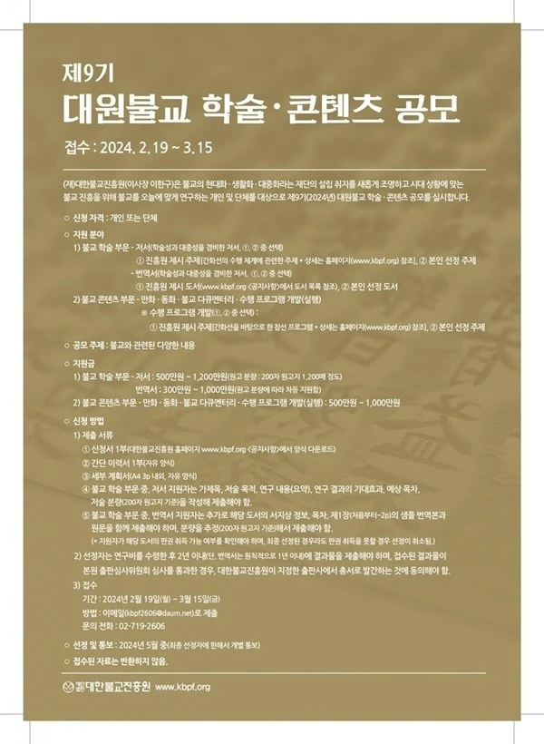 1. 신청서 1부(대한불교진흥원 홈페이지 www.kbpf.org <공지사항>에서 양식 다운로드)