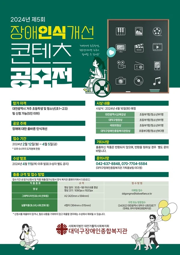 - 2. 우편 또는 방문접수 : (34352) 대전광역시 대덕구 신탄진로77, 연축동, 대덕구장애인종합복지관