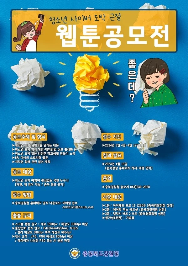 - 웹툰공모전 응모 신청서와 공모전 양식 파일을 충북경찰청 홈페이지 게시글에 공지된 이메일로 제출