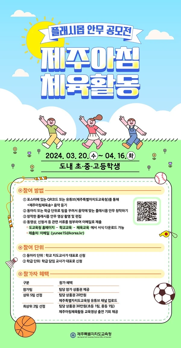 - 최상위 2팀 선정 : 팀당 상품권 30만원(초등 1팀, 중등 1팀), 제주아침체육활동 교육영상 출연 기회 제공