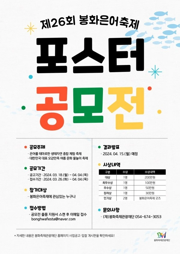 - 제26회 봉화은어축제 홍보 및 참신한 아이디어로 축제 참여 활성화 도모를 위한 포스터 공모