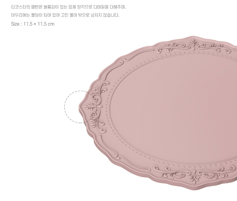 고대 양식에서 모티브를 얻은 실리콘 팈코스터입니다. 우아한 양각의 입체 패턴은 어느 장소에서든 조화롭게 어울리며 고급스러움을 더해줍니다.