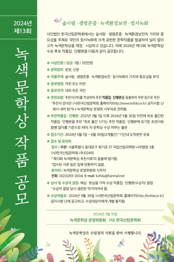 - 수상자발표 : 2024년 9월 30일 (사)한국산림문학회 홈페이지(kofola.or.kr) 공지사항 난에 공고