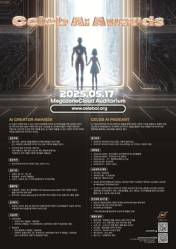 Celeb AI Awards는 AI 기술이 미래에 미칠 수 있는 긍정적 영향력을 주제로 한 AI 창작자들을 위한 글로벌 어워즈입니다..AI 이미지와 영상기술의 무한한 창의성과 가능성을 AI 크리에이터들이 기획한 독창적인 작품으로 선보이며 단순한 경연 대회를 넘어, AI 기술이 창출할 수 있는 사회적 가치와 미래의 혁신을 실질적으로 제시하는 공모전 입니다.