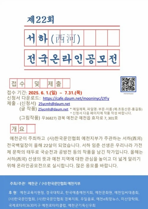 - 대상시상식: 예천예술제한마음백일장행사장(일정: 추후개별안내)