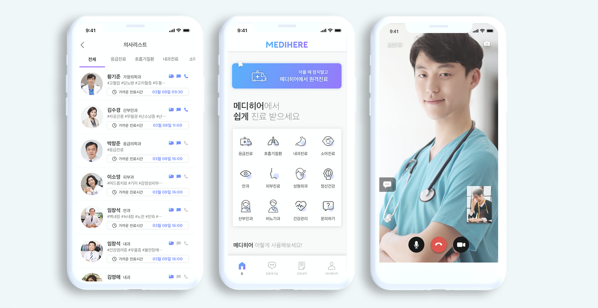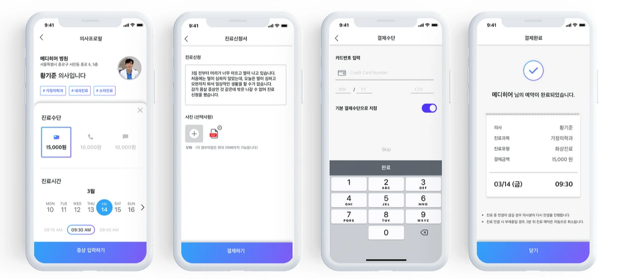 메디히어 애플리케이션은 기존 미국에서 상용화되고 있던 서비스로 화상 채팅 원격 진료 서비스를 제공하는 앱입니다. 코로나19가 한국에 확산이 되면서 국내에도 서비스를 제공하였는데요. 서비스가 가지고 있는 정체성과 또한 서비스의 사용성을 높이는 것 역시 디자이너의 역량을 발휘할 수 있는 부분이라는 생각이 듭니다.