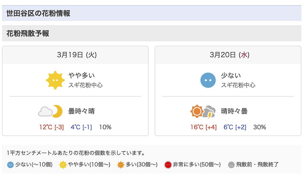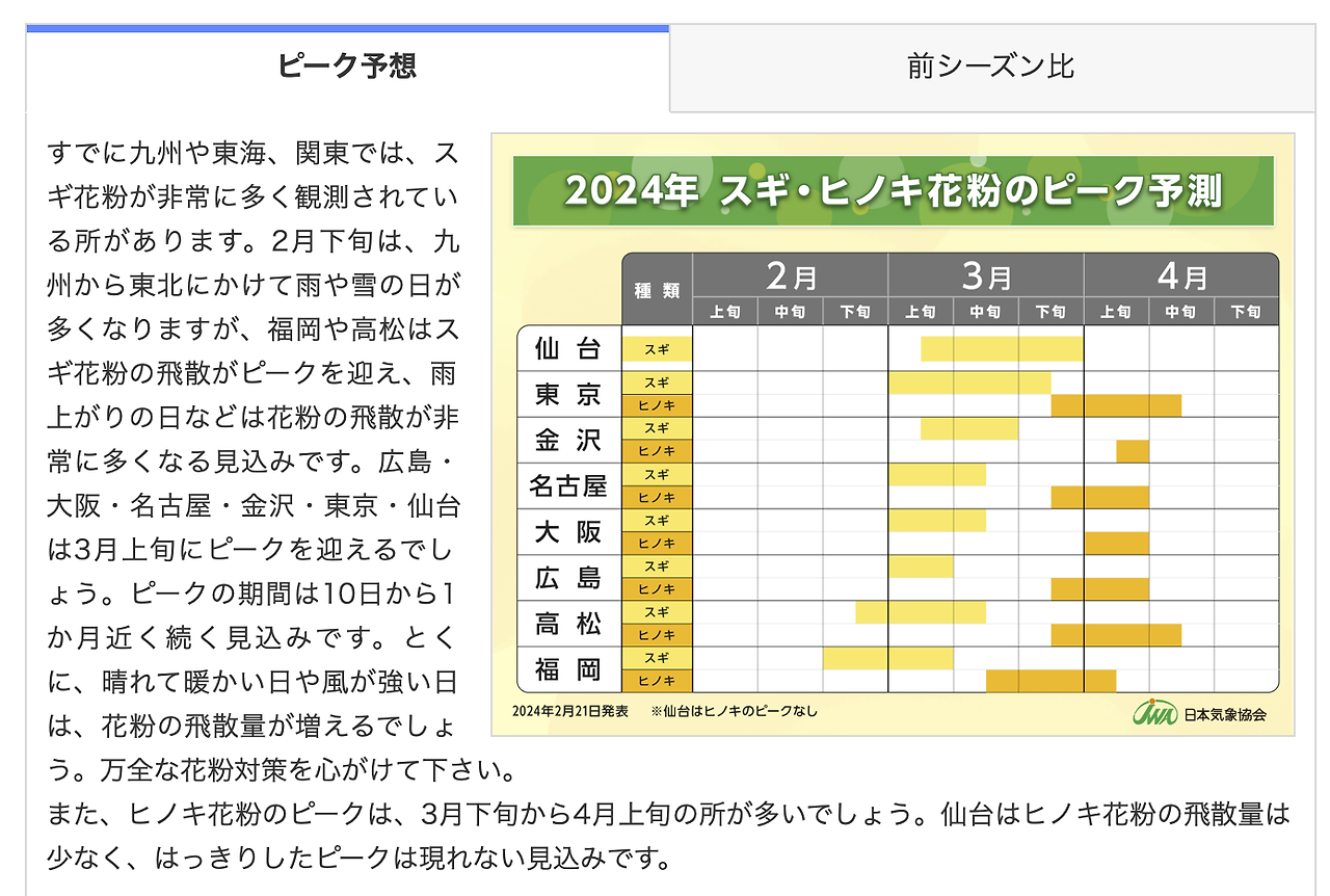 일본기상협회에서는 스기와 히노키 꽃가루가 절정에 이르는 시기를 도시별로 예보한다. 도쿄의 경우 3월부터 4월 중순까지가 절정이고, 다카마쓰의 경우 2월 하순부터 4월 중순까지 절정을 이루기 때문에 도쿄보다 카훈의 절정 기간이 더 길 것으로 예상된다.