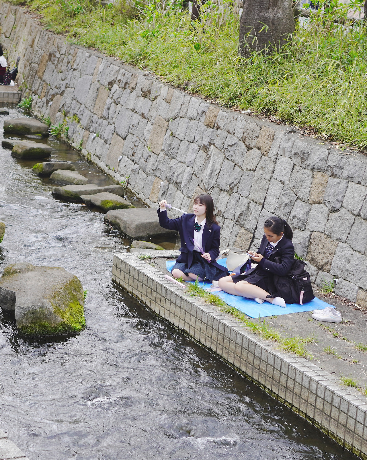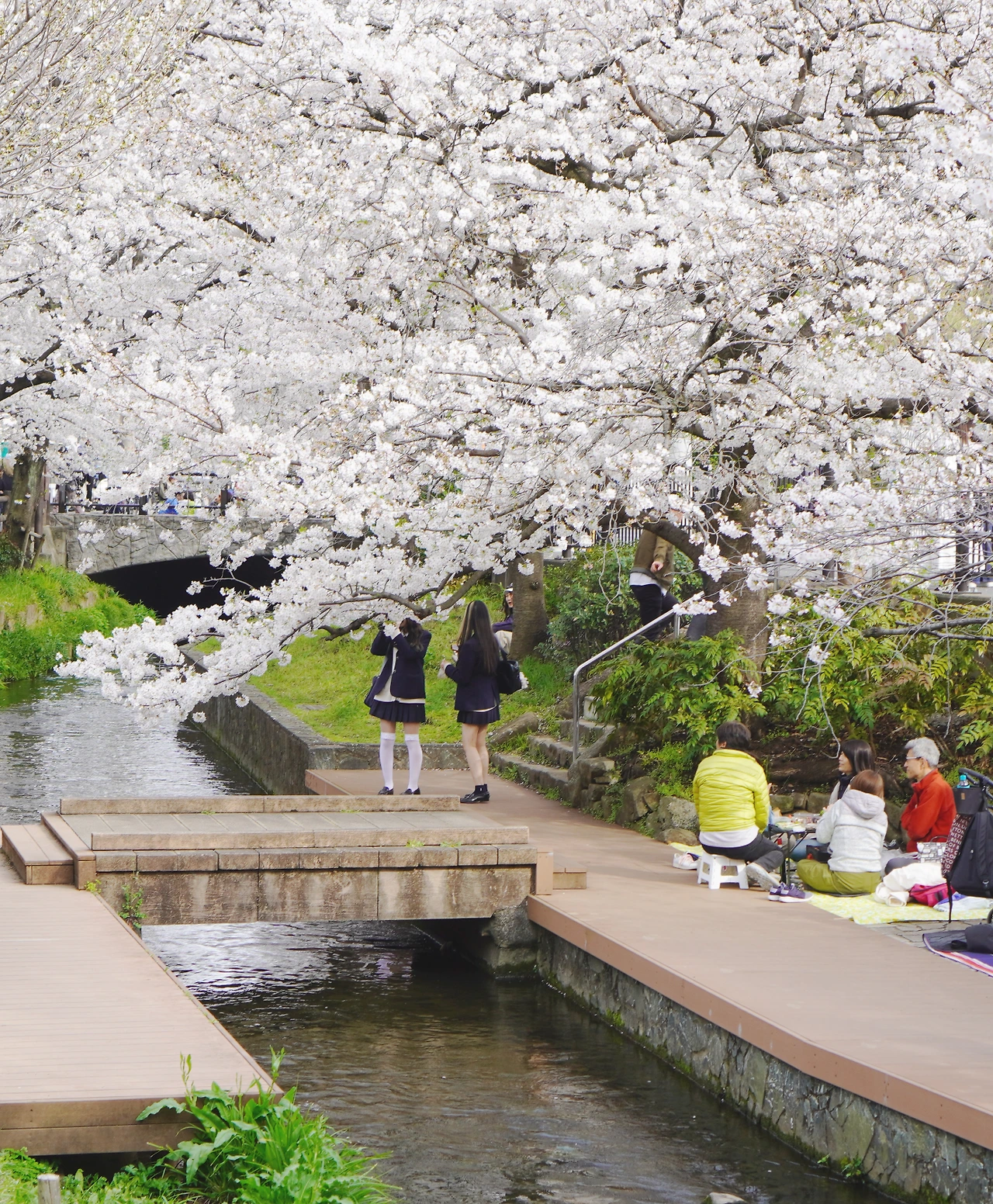 수로를 따라서 벚꽃이 터널을 이룬다. 이곳의 특징은 물가로 내려올 수 있고, 앉아서 쉴 수도 있다는 점이다. 인근 주민들의 가족 단위 하나미가 많아서인지 하나미 메뉴가 매우 화려했다. 야키토리 구워서 먹는 사람들도 있었다!