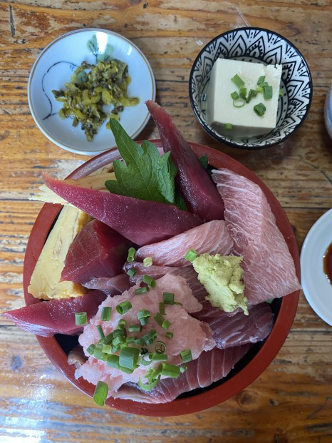 마구로덮밥(마구로즈쿠시동,まぐろづくし丼)과 모둠회 정식(사시미모리아와세테쇼쿠, 刺身盛り合わせ定食)을 추천한다. 1000엔대에 먹어도 먹어도 줄지 않는 밥과 회를 먹을 수 있다.