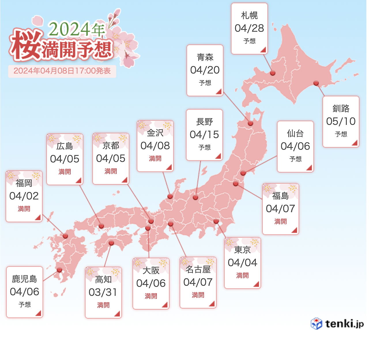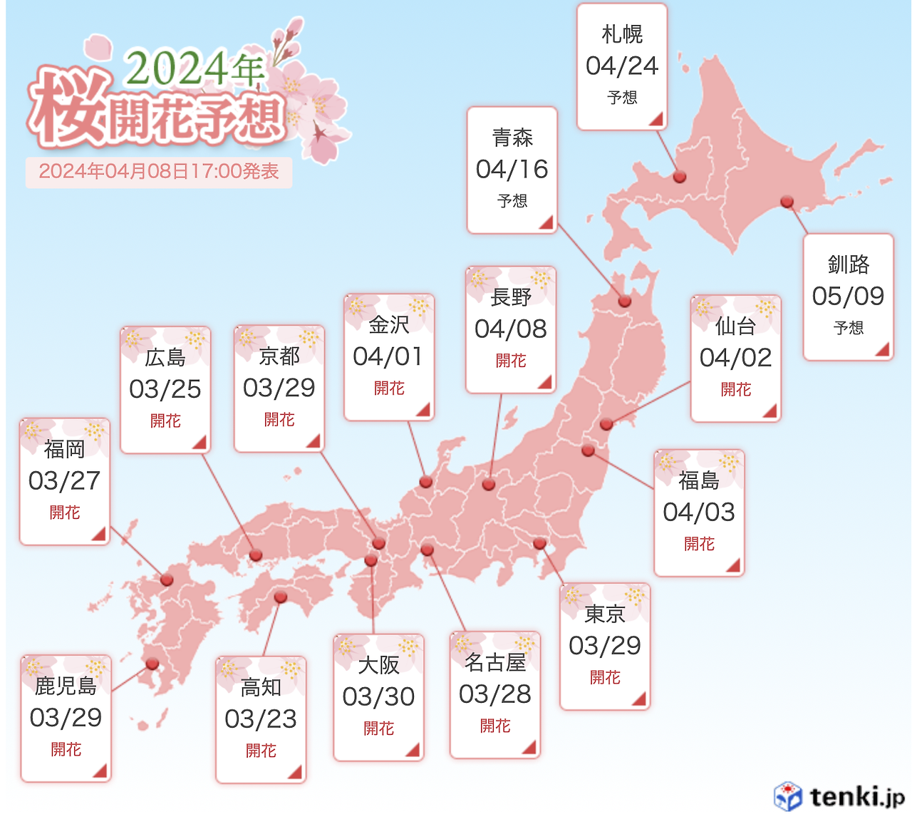 2024년 3월 16일 일본기상협회의 발표 기준에 따르면 도쿄에서 벚꽃이 2024년 3월 20일 개화, 3월 28일 만개할 것으로 예측했다. (개화와 만개일은 기상 상황에 맞춰서 매일 갱신된다.) 그러나 추위가 뒤늦게까지 기승을 부리며 매년 빨라지던 만개 시기가 올해는 주춤했다.