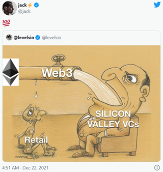 하지만 WEB3에 대한 긍정적인 관점과는 반대로 부정적인 시선도 많다. 최근에 트위터 창업자 잭 도시(Jack Dorsey)는 “WEB3는 사용자가 소유하지 않는다. VC들 및 투자자들이 소유한다”라는 메시지를 통해 VC들을 저격한 바 있다. 이 중 WEB3에 3조원 가까이 투자한 미국의 TOP 벤처캐피탈인 안데레센 호로위츠(Andreessen Horowitz)를 저격하였는데, 일론머스크 또한 이 저격에 동조하며 “WEB3 sounds like bs (WEB3는 X소리이다)”라고 지적한 바 있다. 결국 이들의 주장에 따르면 WEB3의 실체는 VC만 배불려 주는 상황이라는 이야기다.