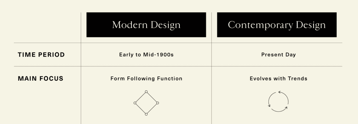 위의 테이블에 나타난 것처럼, 모던 디자인은 1900년대 중반 등장한 기능을 중시하는 디자인이다. 사용자의 편리성에 기본을 둔 디자인은 제품의 개별성 보다 대중성(General Users)에 보다 가치를 둔다. 이에 반해 컨템퍼러리 디자인은 트렌드에 초점을 둔다. 현재 마켓 혹은 사용자가 추구하는 방향에서 이 용어를 사용하게 된다.