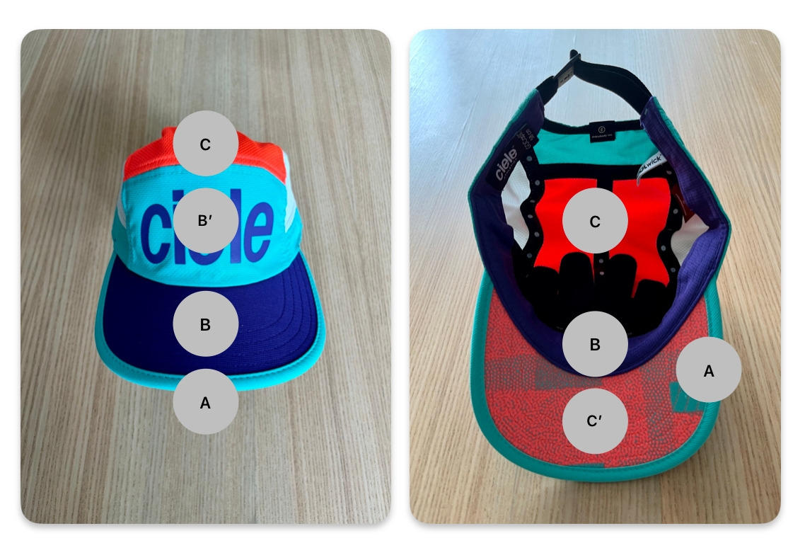 C‘의 주황 프린팅 색상은 Crown C의 fabric 색상과 연결되고, C‘의 스카이블루 프린팅 색상은 A의 fabric 색상과 연결된다. B‘의 로고 반사체는 B의 Brim 색상과 연결되며 각 조합들의 연결성을 잘 완성해 내었다.