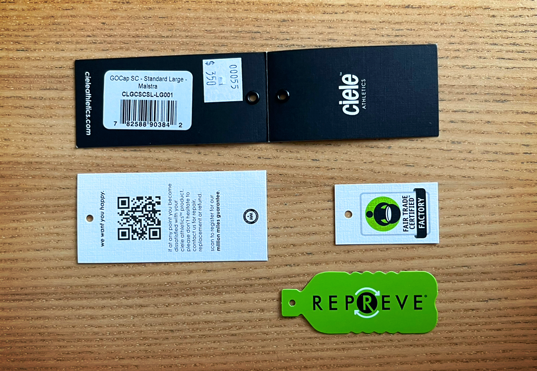 구매할 때 가격 Tag 외에 여러 Tag를 발견할 수 있는데, QR code / Fair trade cerulified factory / Repreve이다. QR code를 통해 제품의 정보 및 관리 방법을 참고할 수 있으며, Fair trade cerulified factory와 Repreve Tag는 Ciele이 친환경을 고려하고 있으며 공정한 회사라는 이미지를 심어준다.