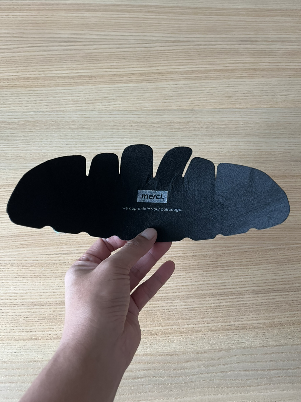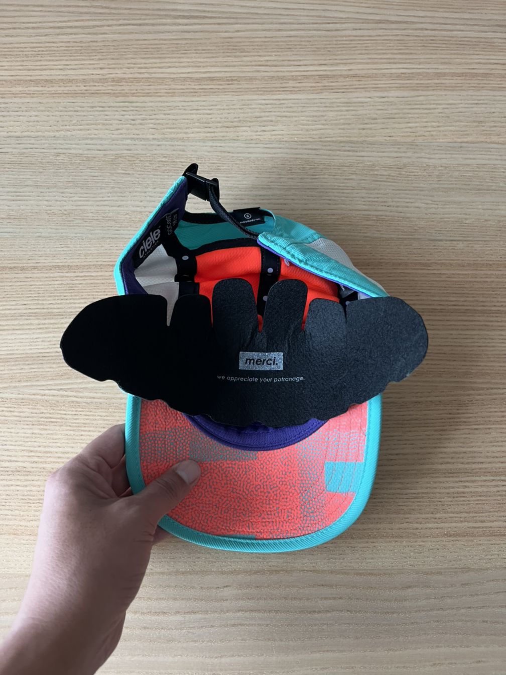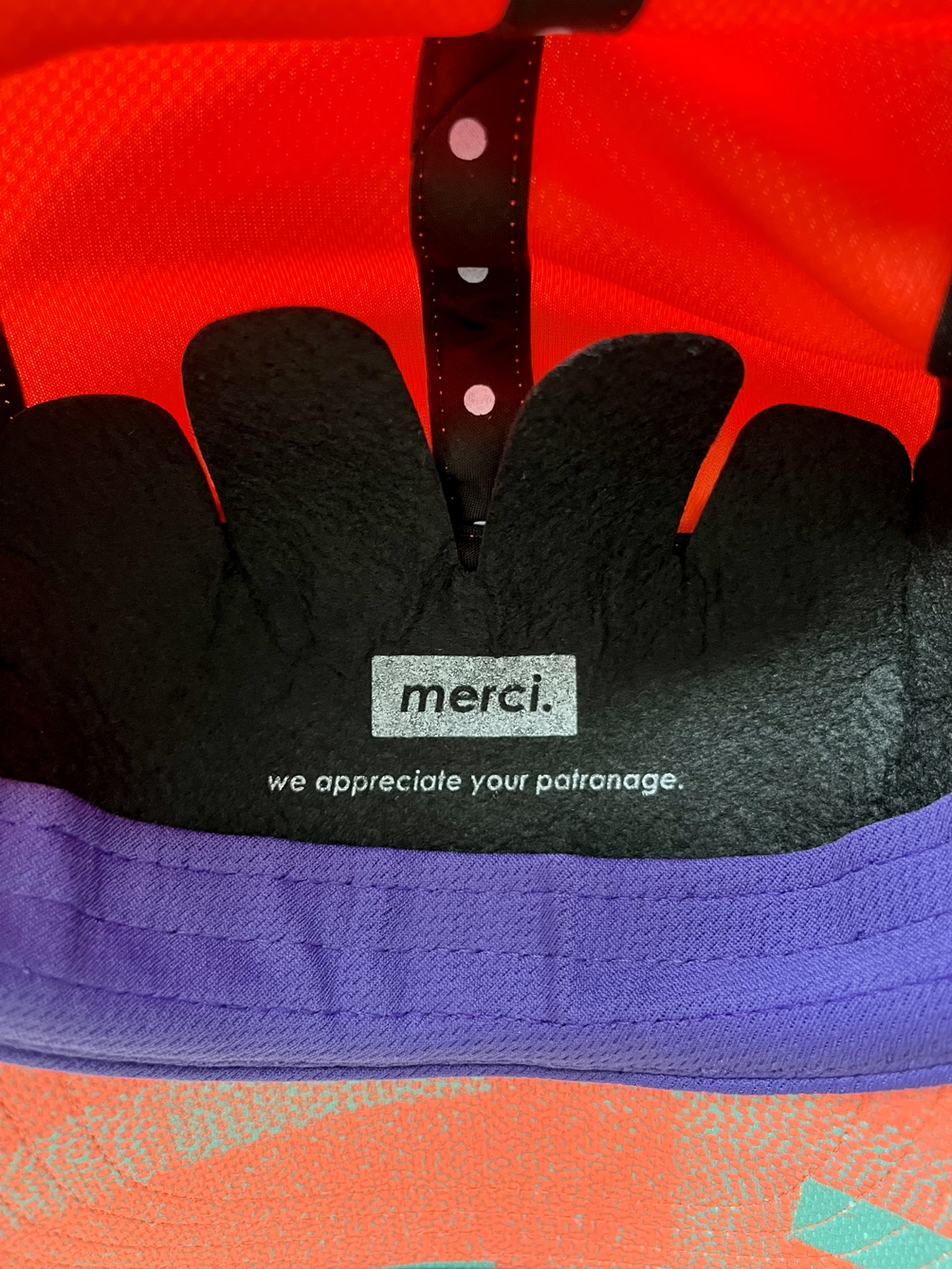 모자 안쪽을 보면, 모자의 형태를 잡아주는 하나의 추가 레이어를 발견하게 된다. 모자를 안 쓸 때, 이 Fabric을 끼워 넣고 보관하면 형태를 오래 유지할 수 있을 것 같다. 그리고 ‘감사합니다. 우리는 여러분의 응원에 감사합니다 Merci, we appreciate your patronage‘라는 문구를 발견하게 된다. 짧은 문구지만, 고객에게 감사한 마음을 전달하는 좋은 방법으로 보인다. 작가 또한 그들의 마음을 느낄 수 있었다.