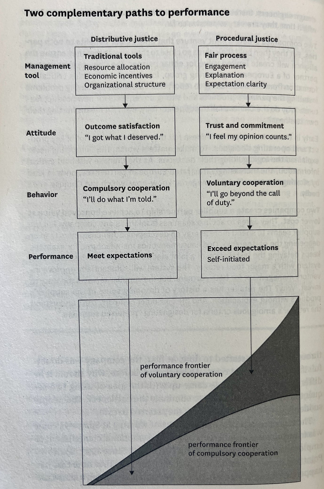 아래의 차트는 매니지먼트 툴을 전통적인 방식과 공정한 과정을 고려한 방식으로 구분하여 이에 따른 직원들의 태도와 행동, 그리고 성과가 어떻게 다른지를 잘 보여준다. 더욱 개인 주도적인 퍼포먼스를 내기 위해서는 공정한 과정을 통한 매니지먼트 툴을 사용해야 한다.