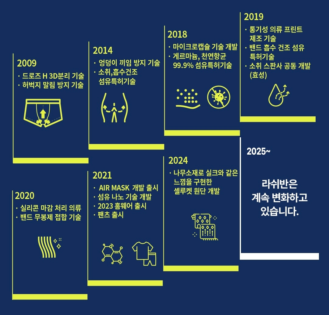 작가는 2014년 제품을 처음 접한 후, 10년 넘게 이 브랜드만을 고집하는 소비자중 한 사람이다. 이유를 돌이켜 보니 대부분의 시간을 책상에 앉아 근무했던 탓에 의자는 쉽게 덥혀졌다. 심지어 여름에는 대나무 소재의 방석을 덧대야만 그 열기가 줄어 들었다. 그때, 접한 브랜드가 라쉬반이었다. 3차원 디자인을 통해 열을 줄여주는 남성의 니즈를 정확히 만족시켜준 유일한 남성 속옷이었다.