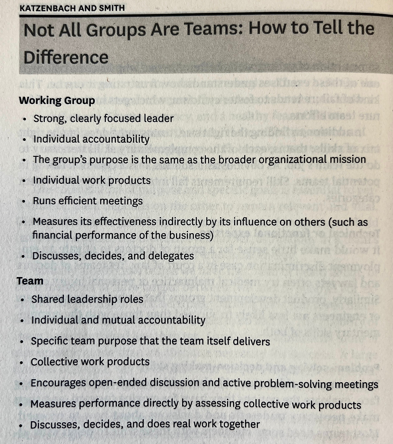 흔히 '팀'이라는 단어가 모호하게 사용되어 매니저들이 그 진정한 의미나 잠재력을 인지하지 못하는 경우가 많다. 팀과 달리, 작업 그룹은 그 성과가 구성원 개개인의 역량에 달려 있다. 반면 팀의 성과는 개인과 상호 간의 역량 및 책임을 요구한다.