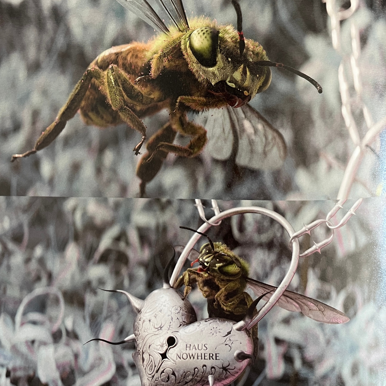 프랑스 기반의 Lou Venesch(루 베네쉬, Lou Benesch로 추정)는 미국과 프랑스 유년기를 바탕으로 자연, 민속, 신화를 섞은 일러스트레이터다. 그녀의 작품은 식물·동물·신화 생물을 결합한 서사를 그려낸다. HAUS NOWHERE SHENZHEN는 ‘곤충왕국’ 일러스트 시리즈를 벽화로 구현했다. 물감과 잉크로 그린 곤충-인간 하이브리드가 공간을 채우며, 전시의 서사적 깊이를 더했다. 특히, 문학적 요소(예: NYT Book Review 커버 스타일)가 곤충 왕국에 동화적 매력을 부여했다