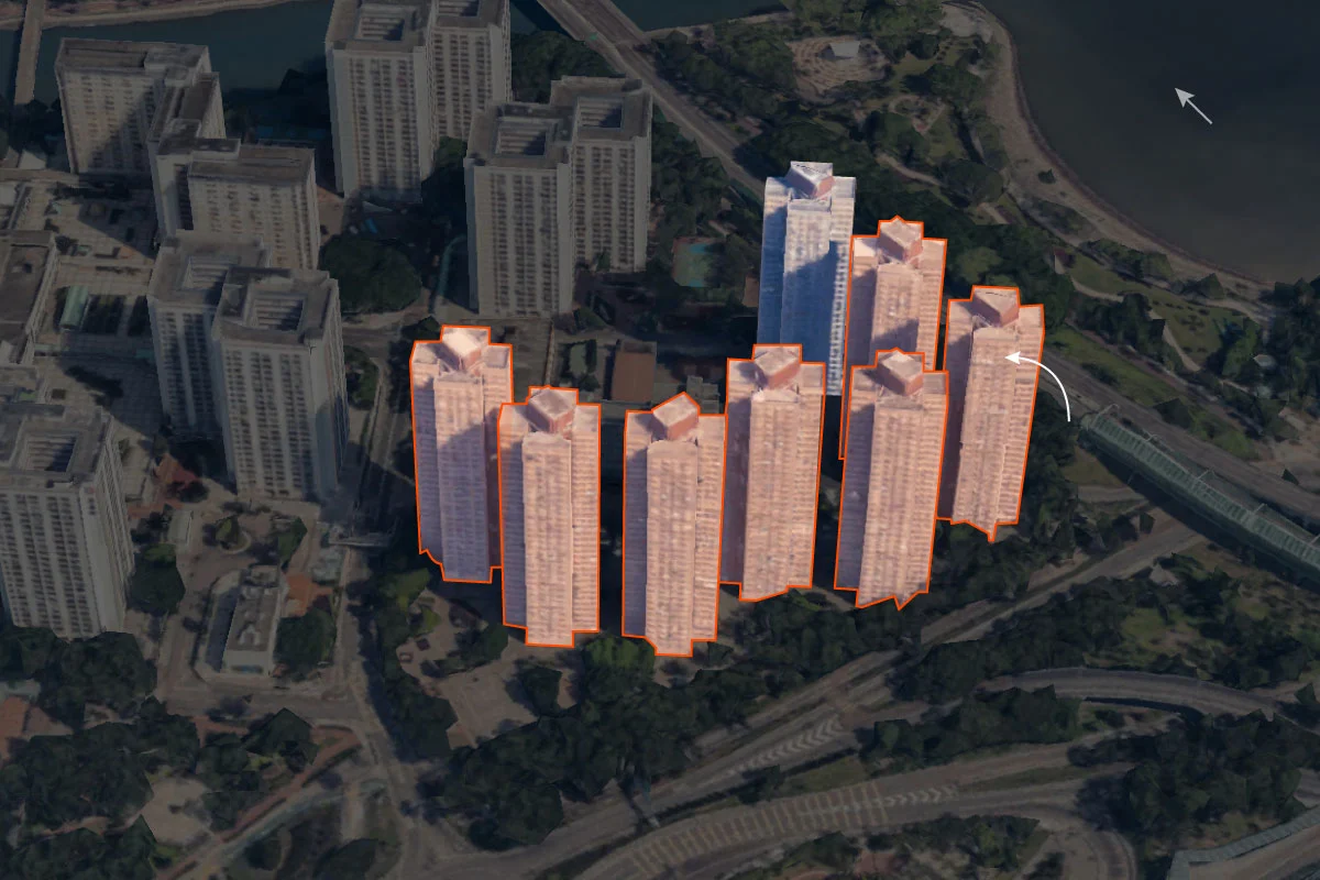 홍콩 신계(New Territories) 타이포(Tai Po)의 Wang Fuk Court 주거단지.