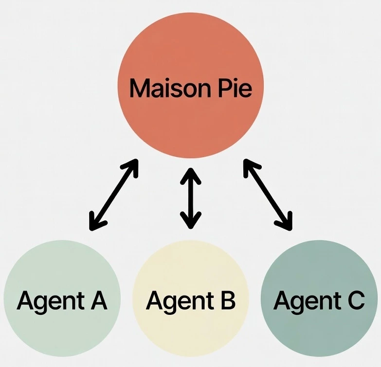 Maison Pie는 총괄기획 및 디자인 리드, 로컬 에이전트와의 공동 협업으로 역할을 구분하였다. 향후, 세 명의 에이전트와 일할 예정이며 각각 Agent-A: 작가 혹은 스토리텔러, Agent-B: 공간 디자이너, Agent-C: 아티스트로 구분할 예정이다.