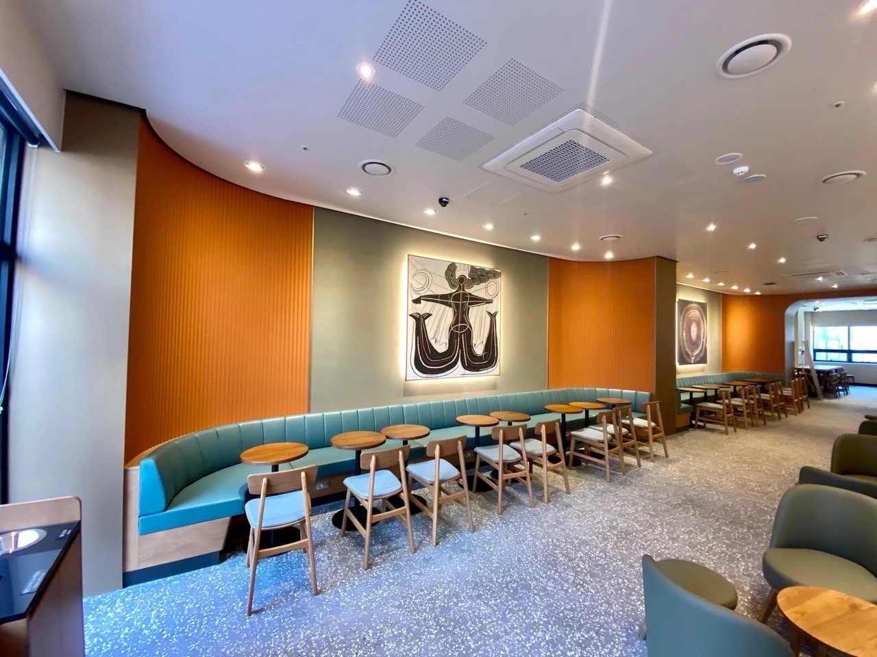 Curvilinear and biomorphic shape. While watching the paintings of Joan Miró, got the impression as if it was painted by a child using crayons. A thick pen head crosses the whiteboard slowly and makes the shape, and finally, some primary and secondary colour pens are filling the shape. Curvilinear than a straight line, organic shape than a geographic one, and less colour than more is drawn on the whiteboard. Features described above are applied to the building façade and major area of the store and turn out a bright and organic mood. In addition to shape and space, artworks are carefully selected considering features of Joan Miró’s paint. These selections are enhancing the overall mood with a bright and breezy look.