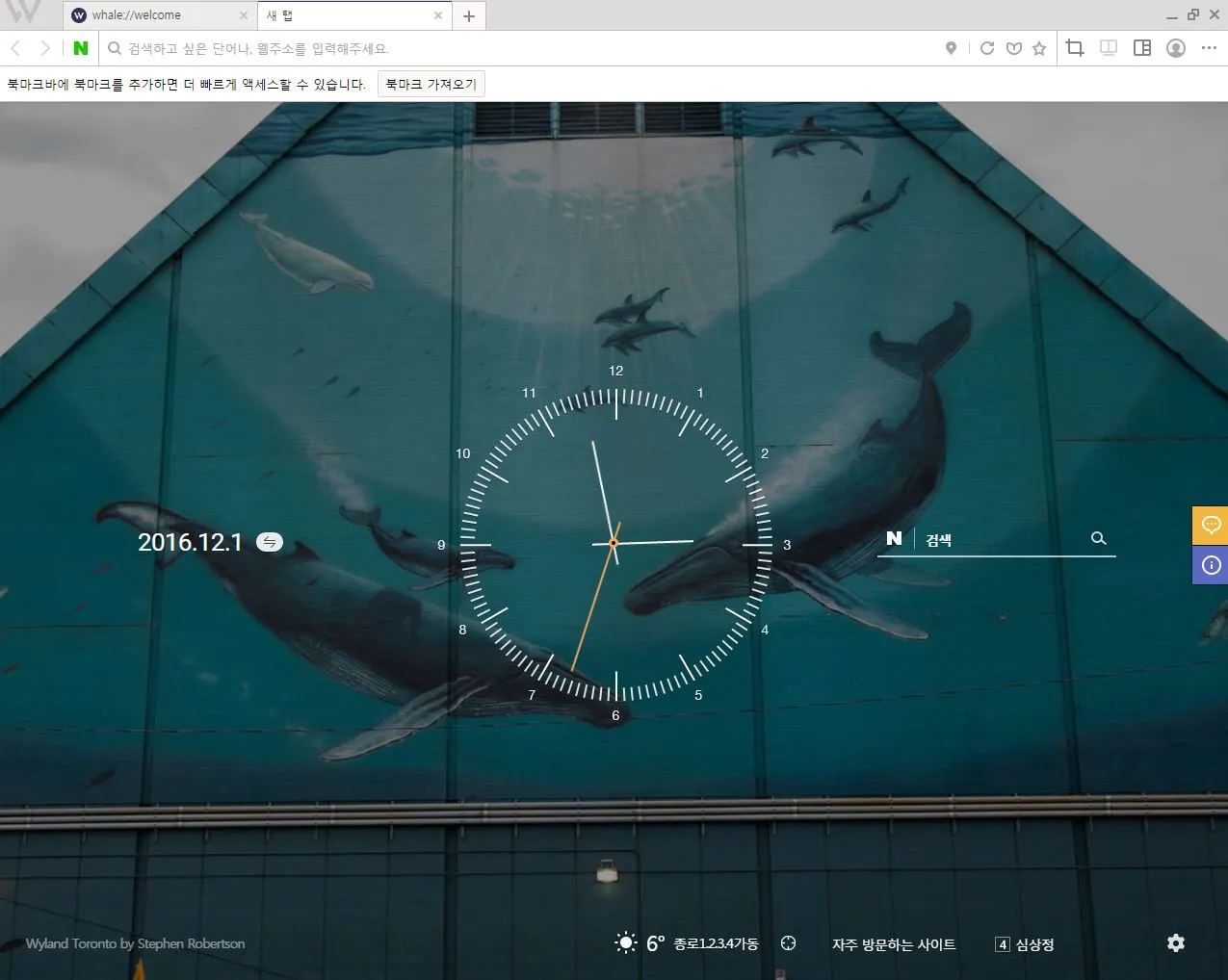 브라우저의 새로운 탭을 열면 등장하는 기본 화면에도 나름 신경을 썼다. 구글 크롬의 경우에는 구글 검색바가 등장하고 인터넷 익스플로러는 기존에 열었던 링크를 한 눈에 보여주는 반면 웨일은 날짜와 시간, 네이버 검색바를 탑재했다. 뒷 배경 역시 다른 웹브라우저에 비해 멋진 편이다.