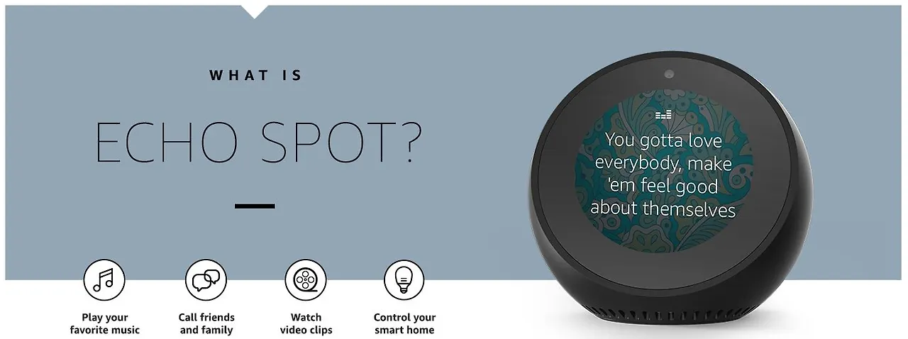 2.5인치의 원형 패널과 카메라가 달려있어 보안 모니터로도 활용이 가능하다고 한다. 물론 화상통화도 가능하다. 디스플레이를 탑재한 제품으로 에코 스팟이 처음은 아니다. 아마존은 7인치의 디스플레이를 탑재한 에코 쇼(Echo Show)를 출시한 바 있다. 에코 스팟은 기존 제품의 장점을 살려 만들어진 스피커다. 음악감상은 물론이고 알람, 날씨, 쇼핑, 홈기기 제어까지 다양한 기능을 선보인다. 에코 쇼의 투박한 디자인보다 훨씬 작고 귀여우며 스마트 홈 허브 기능도 갖춘 똘똘한 녀석이다. TED와 같은 동영상 시청도 가능하다고 하는데 2.5인치라는 스크린으로 만족감을 줄지는 다소 의문이가격은 129.99달러.