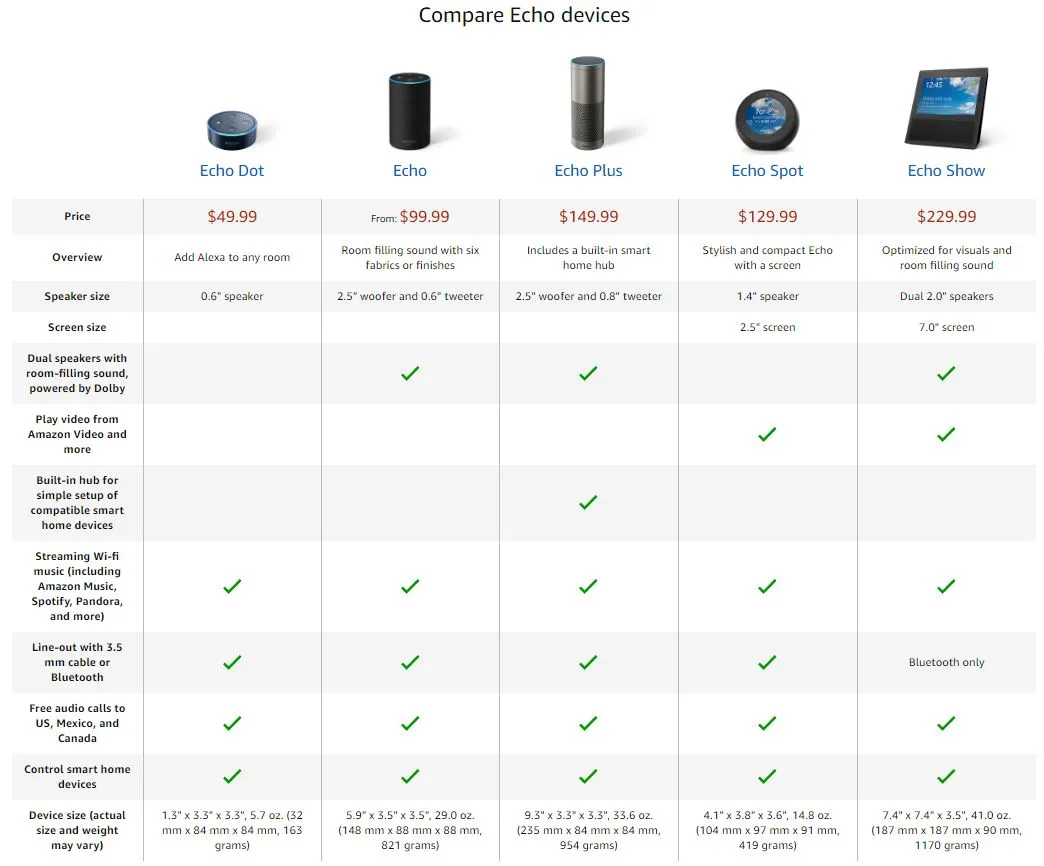 기존 에코 스피커보다 몸집을 줄이고 디자인을 개선한 뉴 에코(New Echo), 홈 허브 역할을 해주는 에코 플러스(Echo Plus), 디스플레이가 탑재된 에코 스팟(Echo Spot), 알렉사에 호환되는 게임에 사용되는 에코 버튼(Echo Button)이 바로 그 제품군이다.