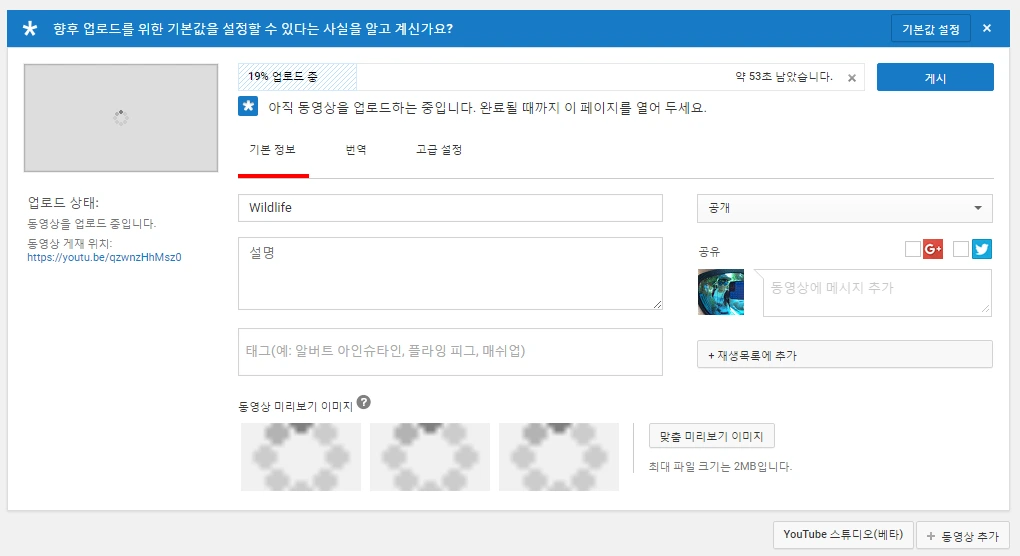 기본정보에서 동영상의 제목을 넣고 동영상에 대한 설명을 기입한다. 아래 검색을 위한 태그를 몇 가지 넣고 동영상 미리보기 이미지를 골라 설정한다. 동영상에 남기고자 하는 코멘트를 붙이고 게시하면 유튜브에 영상이 올라간다. 굉장히 단순하다. 다른 플랫폼에서도 유사한 기능을 부여하고 있는 만큼 동영상 제작 과정은 엄청나게 길어도 업로드하는 절차는 상당히 간단하다.