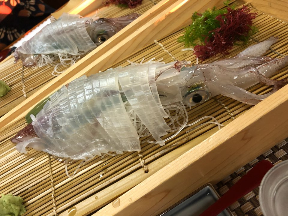 가라쓰에서는 오징어가 꽤 유명한 편이다. 이른바 '가라쓰의 명물'이라 불리는 오징어는 팔팔 튈 정도로 싱싱하다. 한치와 비슷하게 생긴 이 곳의 오징어는 몸통만 얇게 회를 쳐서 서비스되고 다리를 포함해 회를 먹고 남은 부분들은 튀김(天ぷら)으로 제공된다.