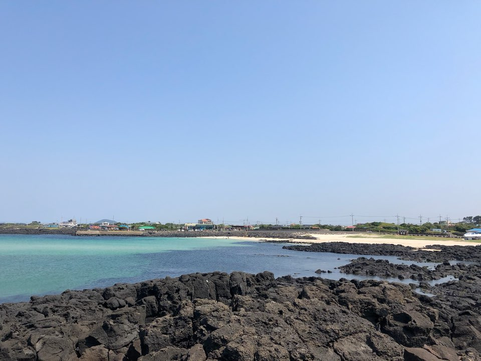이 곳은 우리가 5년 전 찾았던 논짓물 해변가 바로 앞. 이 해변가에는 땅에서 솟아나는 용천수와 바닷물이 만나는 곳으로 담수와 해수를 동시에 즐길 수 있다고 한다. 따갑게 느껴지는 햇살이 바다와 만나 눈부시게 빛이 났다. 5년 전과 달리 우린 셋이 되었고 다시 이 곳에 왔다.