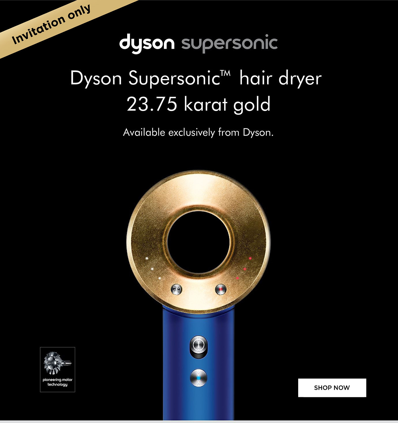 '진짜' 다이슨을 잠깐 살펴보자. 왕립예술대학 산업디자인을 전공한 수석 엔지니어 제임스 다이슨(James Dyson)이 1993년 설립한 기업으로 현재는 영국에 본사를 두고 있는데 2021년 싱가포르(Singapore)로 해드 오피스를 옮긴다고 한다. 날개가 없는 선풍기나 공기청정기 그리고 헤어 드라이기의 경우 상당히 파격적이기도 했다. 헤어 드라이기의 몸집은 작은 대신 'Super Sonic'이라는 키워드를 붙여 강력함을 드러내기도 했다. 위 이미지와 같이 23.75캐럿으로 금도금을 한 스페셜 제품(Real Gold version)도 있다. 가격은 56만 원. 필자 개인에게 있어 헤어 드라이기를 이 가격에 구매한다는 것은 '완벽한 사치'다.