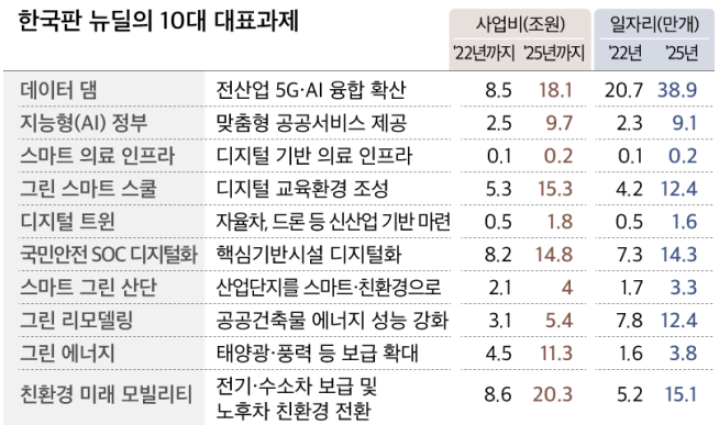앞으로 5년간 전체 160조 원 규모의 예산을 투입하여 일자리만 무려 150만 개를 만들겠다는 구상인데 여기에는 국가 예산과 더불어 민간 기업 투자도 포함한다. 이러한 투자를 기반으로 한 한국판 뉴딜 즉 대한민국의 향후 10대 대표사업은 다음과 같다.