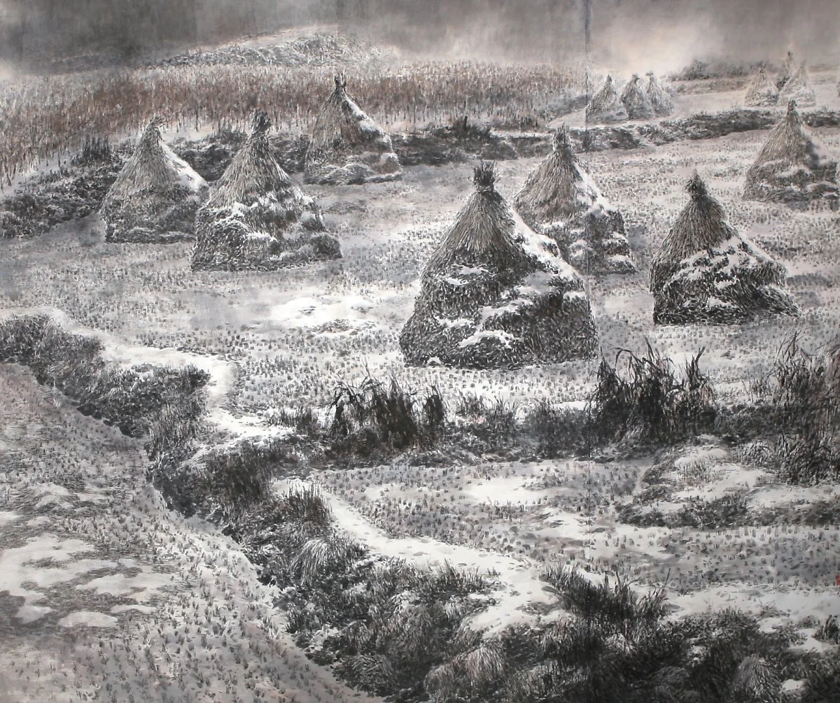 여주 영릉 인근의 일상적 풍경을 점을 찍고 선으로 이어 물들이는 '염'의 수묵기법으로 묘사한 작품이다. 모든 것의 근간이 되는 대지와 그것을 일구며 살아왔던 우리 부모세대들은 이제 차갑게 쌓인 눈처럼 외면받고 있는 현실에 이른 것은 아닐까? 귀농하고 귀촌하는 '리틀 포레스트'의 삶이 간혹 보이기도 하지만 정작 농촌을 등지고 도시로 떠나는 시대상이 되어 시골마을은 늘 한적하고 고요하다. 작품 역시 차갑고 쓸쓸하다. 하지만 추수가 끝나고 쌓아놓은 볏짚들에서 묵묵히 삶의 터전을 지키고 땀 흘려 일하는 농민들의 긍지와 자부심, 풍요와 평화로움을 던진다.