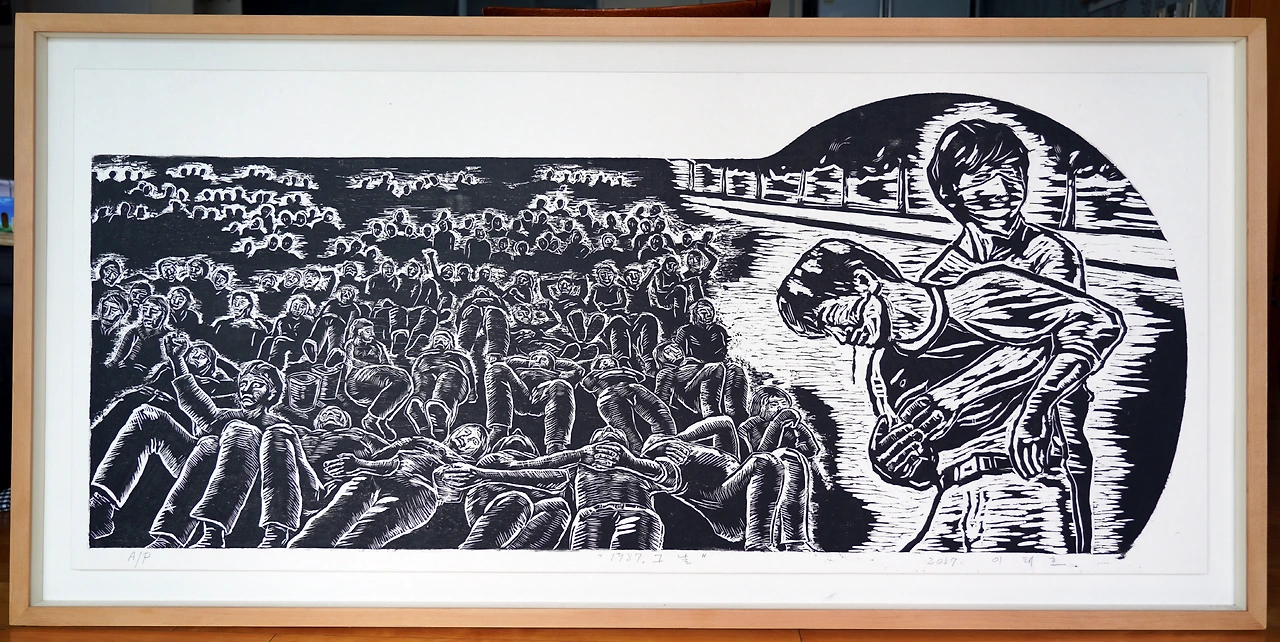 1987년에 있던 장면 중 가장 강렬하게 새겨진 기억을 단색 목판화로 제작한 이태호 작가의 작품이다.