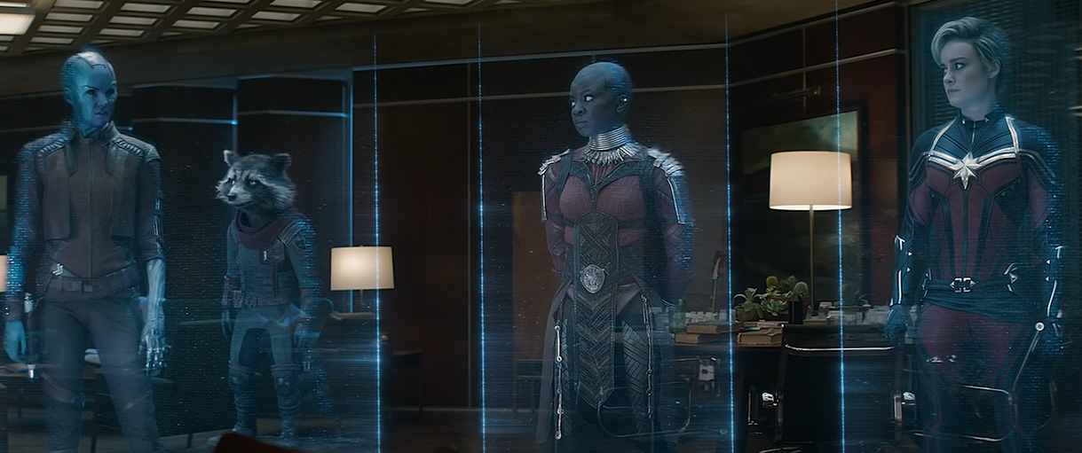 <어벤져스 : 엔드게임>에서 나타샤(스칼렛 요한슨) 앞에 나타난 어벤져스들이 홀로그램으로 표현되고 있다. 출처 : Walt Disney Korea
