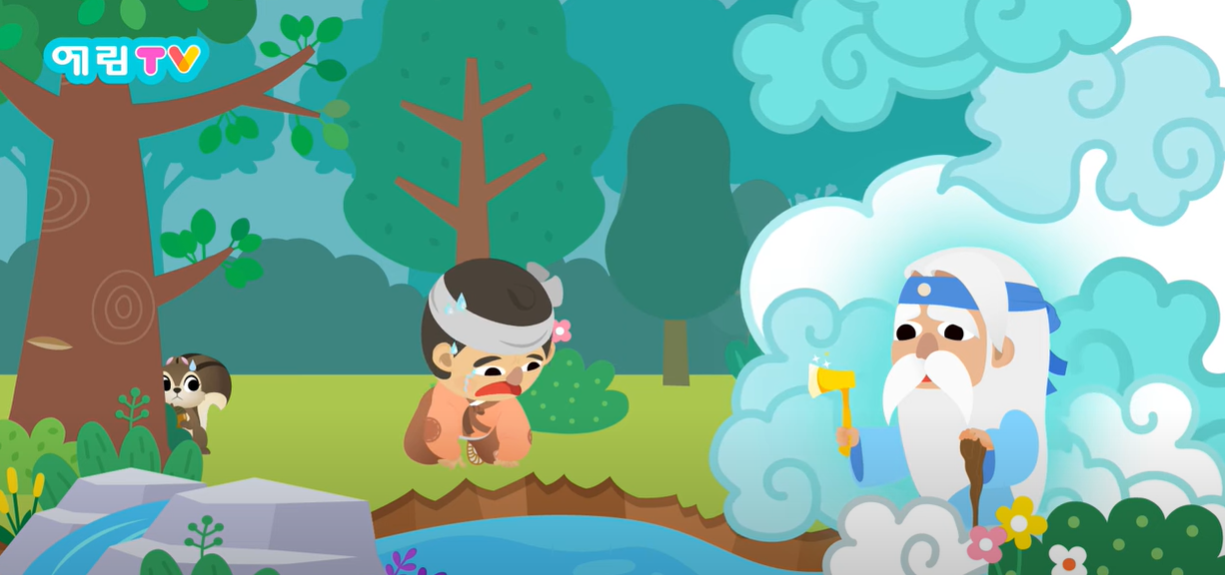 나무에서 내려와 어쩔 줄 모르던 나무꾼 앞으로 누군가가 나타났습니다. 주변이 황금빛으로 물들어 눈이 부실 정도였습니다. 금도끼를 들고 나타난 산신령이었습니다.