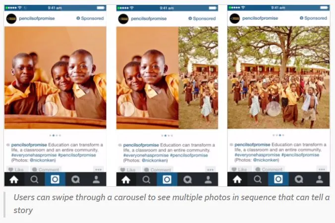 인스타그램은 '캐러셀'이라는 광고 플랫폼을 개발해 사용자 대상으로 출시했다. '캐러셀(carousel)'은 슬라이드 형태로 광고 이미지를 보여준다. 여기서 '더 보기' 버튼을 누르면 광고 페이지로 이동된다. 영단어 캐러셀은 'merry-go-round' 즉 '회전목마'라는 의미를 갖고 있다.