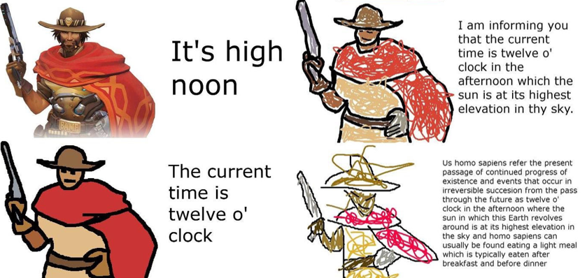 수능 : (조금 과하게 말해서) "I am informing you that the current time is twelve o'clock in the afternoon which the sun is at its highest elevation in the sky"