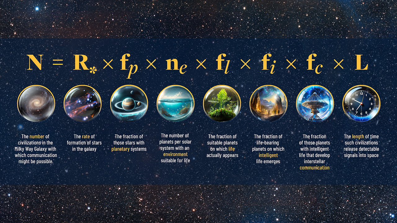 여기서 N은 우리 은하 내에 교신이 가능한 지적 외계 문명의 수입니다. 이를 풀어내려면 그 안에 담긴 항들을 알아봐야겠죠.
